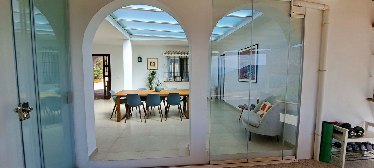 The heart of this home is its covered interior space. This space provides access to the living room and spacious kitchen. It also provides access to the three spacious bedrooms and two bathrooms. The direct connection to the covered terrace creates a wonderful combination of indoor and outdoor space. During the colder winter months, the interior space can be closed off from the outdoor terrace with luxurious glass curtains.