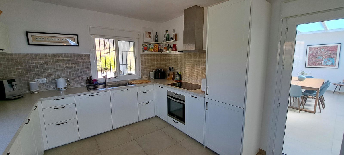 The kitchen is very spacious and equipped with all the necessary built-in appliances. In addition, the washing machine is connected in one of the kitchen cupboards. From the kitchen, there is access to the spacious living room, which has several windows for a beautiful view and lovely light, as well as air conditioning and a wood-burning stove.
