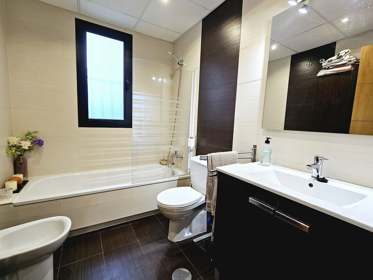 Inside, the apartment features three spacious bedrooms and two bathrooms. The master bedroom boasts an en-suite bathroom with a Jacuzzi bathtub and separate shower, while the other two bedrooms share a generous family bathroom. All bedrooms offer direct access to the lush garden and terrace, ensuring a bright and airy feel throughout.