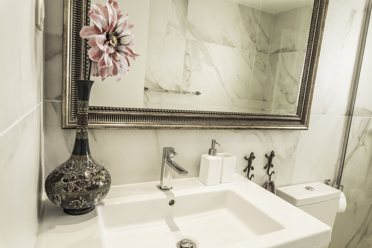 A sophisticated, modern stairway with a large window leads us upstairs to the master bedroom and a solarium. The master suite comes with ample built-in closets. The ensuite bathroom is done in black slabs with white veining, which, juxtaposed with the white sink and cabinetry, makes it simply stunning!! The solarium is ideal for sunbathing, as it is entirely private, with a high table where one can enjoy a snack and, undoubtedly, the incredible 360º views.