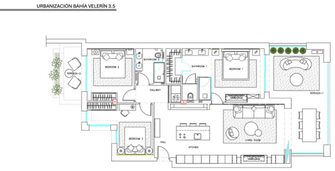 Bahía del Velerín 3.5 is a turnkey luxury apartment in a prime beachfront setting, refurbished to exceptional standards and ready for immediate occupation or rental. With 3 bedrooms, 2 bathrooms, 120 m² of elegant interior space and a 38 m² terrace overlooking lush gardens and the Mediterranean Sea, this home represents an outstanding opportunity.