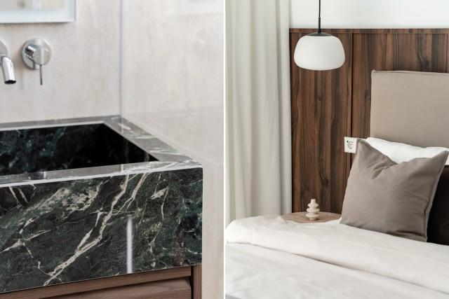 The main floor’s open-plan kitchen, dining, and living space flows directly onto a generous south-facing terrace, perfect for slow mornings or dinners under the stars. The kitchen features elegant Italian marble countertops and a built-in wine bar, while a guest en-suite bedroom with its own terrace offers privacy and comfort for visitors.