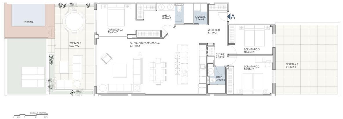 The property itself is an elevated ground-floor apartment featuring three spacious bedrooms, all with fitted wardrobes, and two modern bathrooms. The open-plan living area has been finished to an exceptionally high standard and includes a fully fitted NEFF kitchen, complemented by a separate utility room with space for both a washer and dryer. Comfort is ensured year-round thanks to air conditioning with individual temperature control in each room and underfloor heating throughout the entire apartment.