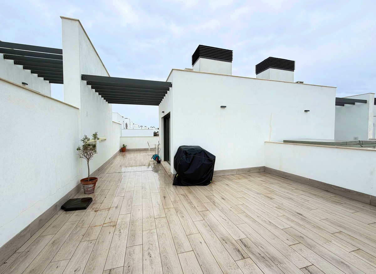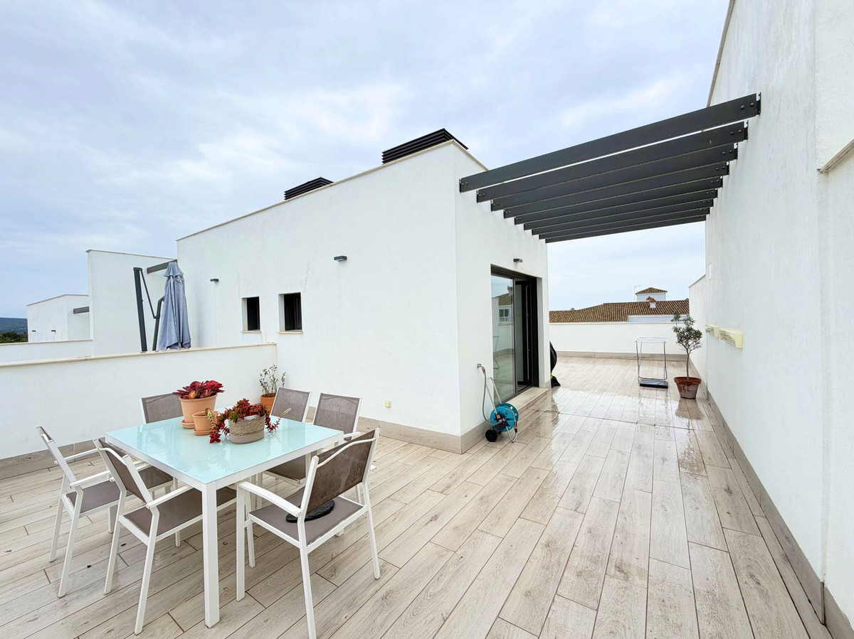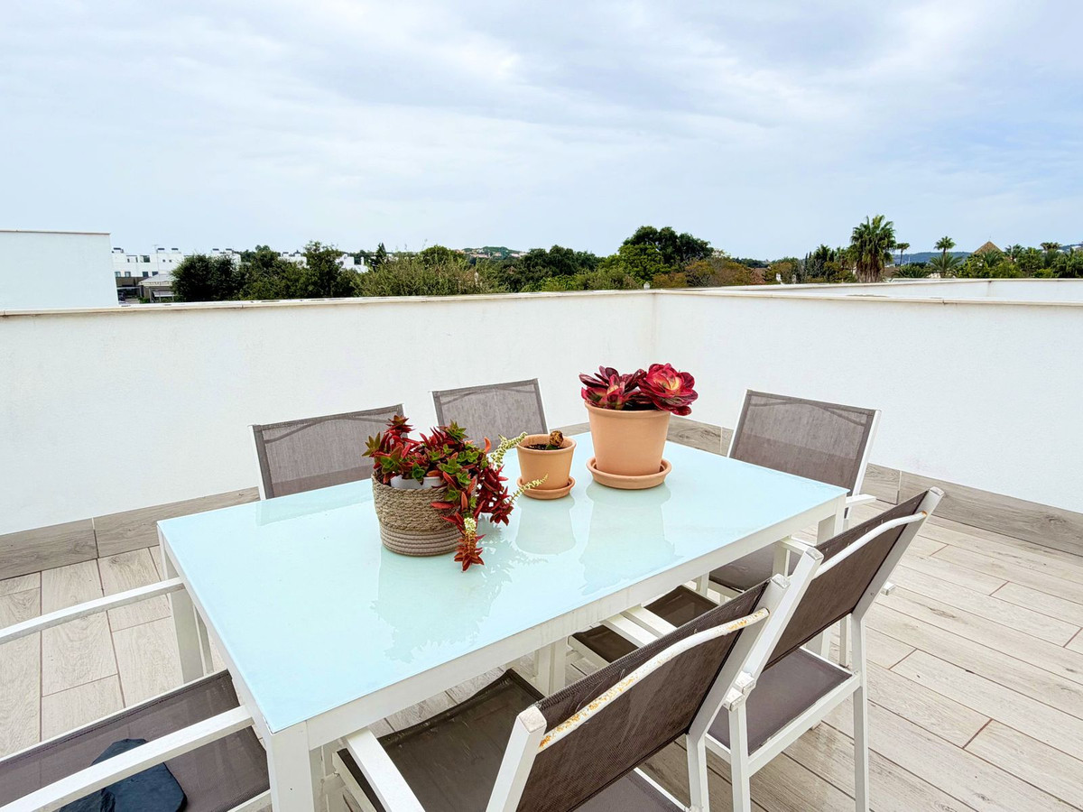 On the upper floor, the master bedroom stands out with its en-suite bathroom and a glass-enclosed balcony. Two additional bright bedrooms, both with fitted wardrobes, share a full bathroom and have access to a second balcony overlooking the community entrance. One level above, the rooftop solarium offers a spectacular setting: a large open space with panoramic views of the sea, golf course, and natural surroundings—ideal for creating a chill-out area, adding a barbecue, or simply enjoying sunlight and privacy. Two private parking spaces, electric blinds, high-quality finishes, and the option to convert the current study into a fourth bedroom complete a home designed for enjoyment without compromise.