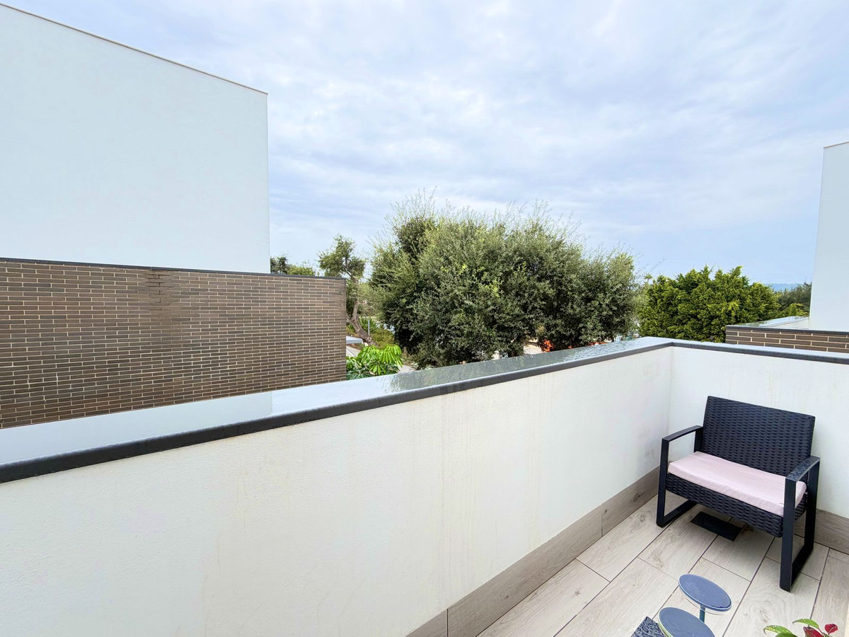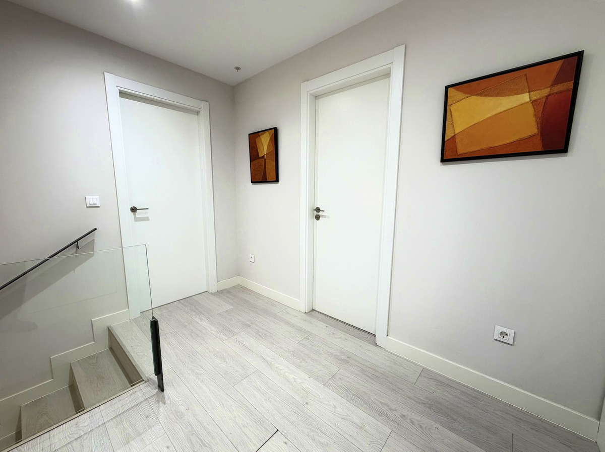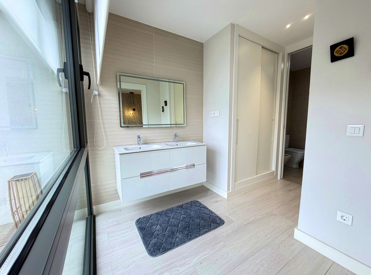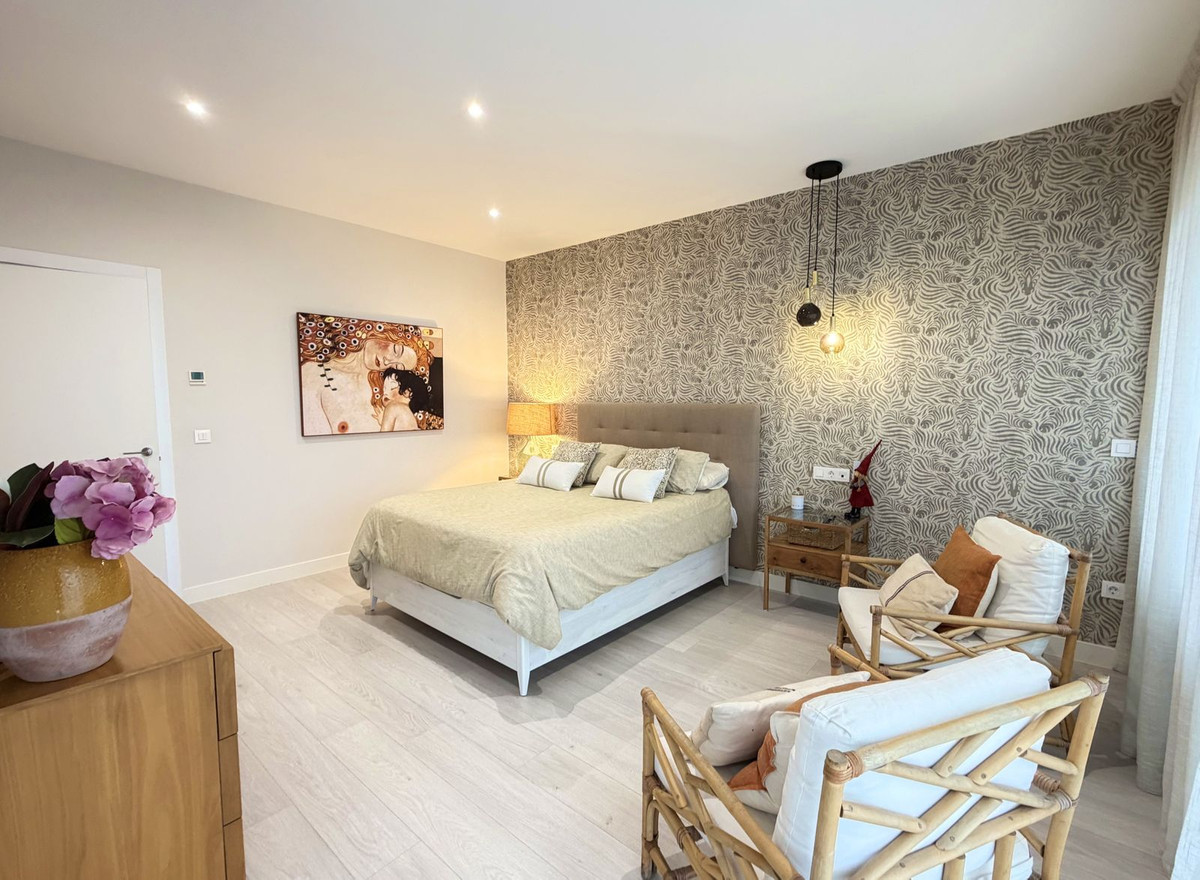 On the upper floor, the master bedroom stands out with its en-suite bathroom and a glass-enclosed balcony. Two additional bright bedrooms, both with fitted wardrobes, share a full bathroom and have access to a second balcony overlooking the community entrance. One level above, the rooftop solarium offers a spectacular setting: a large open space with panoramic views of the sea, golf course, and natural surroundings—ideal for creating a chill-out area, adding a barbecue, or simply enjoying sunlight and privacy. Two private parking spaces, electric blinds, high-quality finishes, and the option to convert the current study into a fourth bedroom complete a home designed for enjoyment without compromise.
