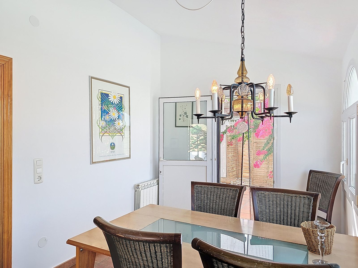 The main house has a built area of 287 square metres and a usable area of 215 square metres. Inside, you'll find five generously sized bedrooms, two full bathrooms, a large, light-filled living room with a wood-burning stove, and a fully equipped kitchen that flows into a welcoming dining area. The dining room overlooks the 8 x 4 metre private swimming pool — a beautiful focal point for relaxing or entertaining.