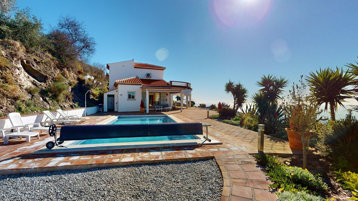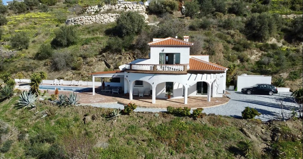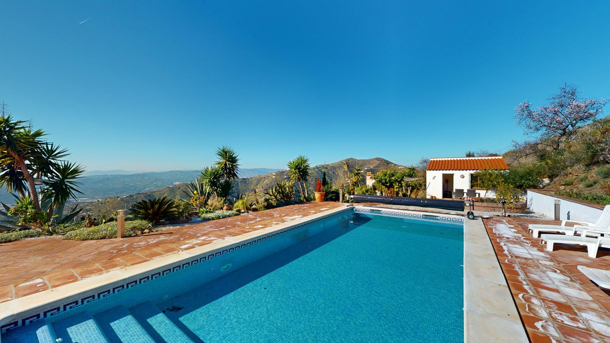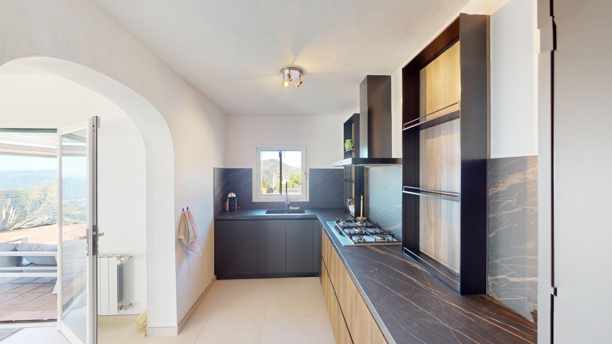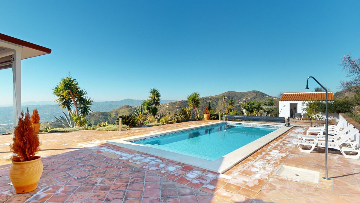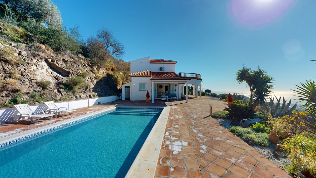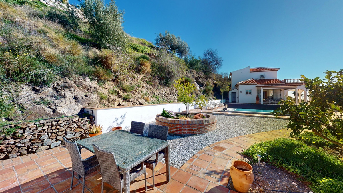 This recently renovated villa is located in a spectacular spot on Bentomiz Mountain in Arenas, just 5 minutes from the charming whitewashed village of Arenas, 20 minutes from the beaches of Algarrobo Costa, and 50 minutes from Málaga Airport, offering the perfect balance between tranquility and accessibility. The property stands out for its brightness, modern design, and high-quality finishes, featuring a spacious open-plan living room, dining area, and a fully equipped modern kitchen with top-tier appliances, including a gas cooktop, oven, dishwasher, and integrated fridge-freezer. The dining area opens onto a covered terrace, perfect for relaxing or enjoying outdoor meals. The villa boasts 3 bedrooms and 3 bathrooms, two of which are en-suite. On the ground floor, there is one bedroom with an en-suite bathroom featuring a shower, toilet, and sink, as well as air conditioning, and a second bedroom with a separate bathroom that includes a bathtub, shower, toilet, and sink. The master bedroom, located on the upper floor, features air conditioning, an en-suite bathroom with a shower, toilet, and sink, a walk-in closet, and direct access to a rooftop terrace offering breathtaking panoramic views and unforgettable sunsets. All bedrooms and the living room are equipped with ceiling fans for added comfort during the summer months. The outdoor area includes an automated saltwater heated pool measuring 9.5 meters by 5 meters and an automatic irrigation system to keep the garden in pristine condition. The property also has a shared well and a water storage tank with a 12,000-liter capacity. Several terraces with shaded areas enhance the outdoor space, one of which can be enclosed with a retractable awning. The villa is equipped with state-of-the-art technology, including 8 solar panels with a 6 kW inverter, central heating, hot water via a gas boiler, double-glazed windows and doors with anti-theft protection, a comprehensive security system with 24/7 monitoring, and a smart home system that controls lighting, the heat pump, solar panels, and water tank levels. This property seamlessly blends comfort, style, and sustainability in a privileged setting. Contact us today for more information or to schedule a viewing, either in person or virtually.