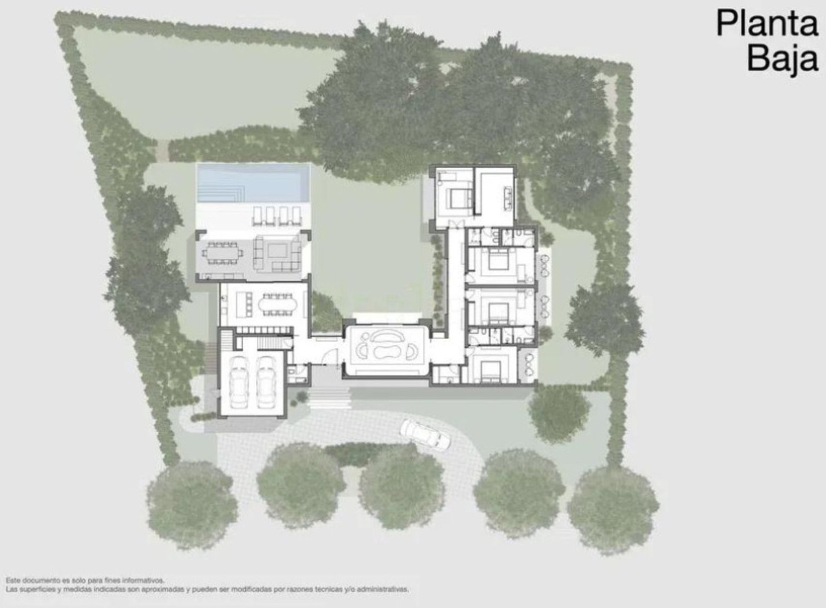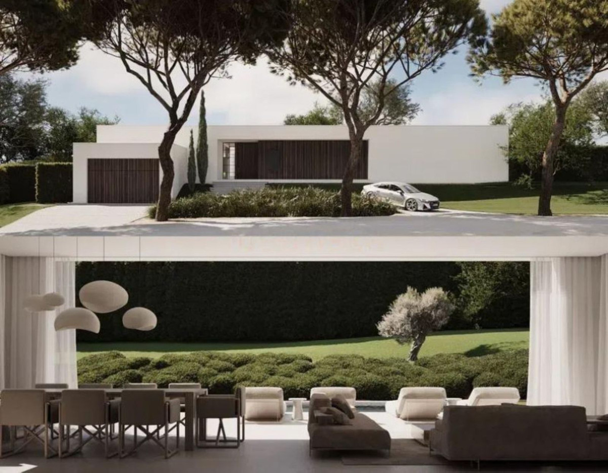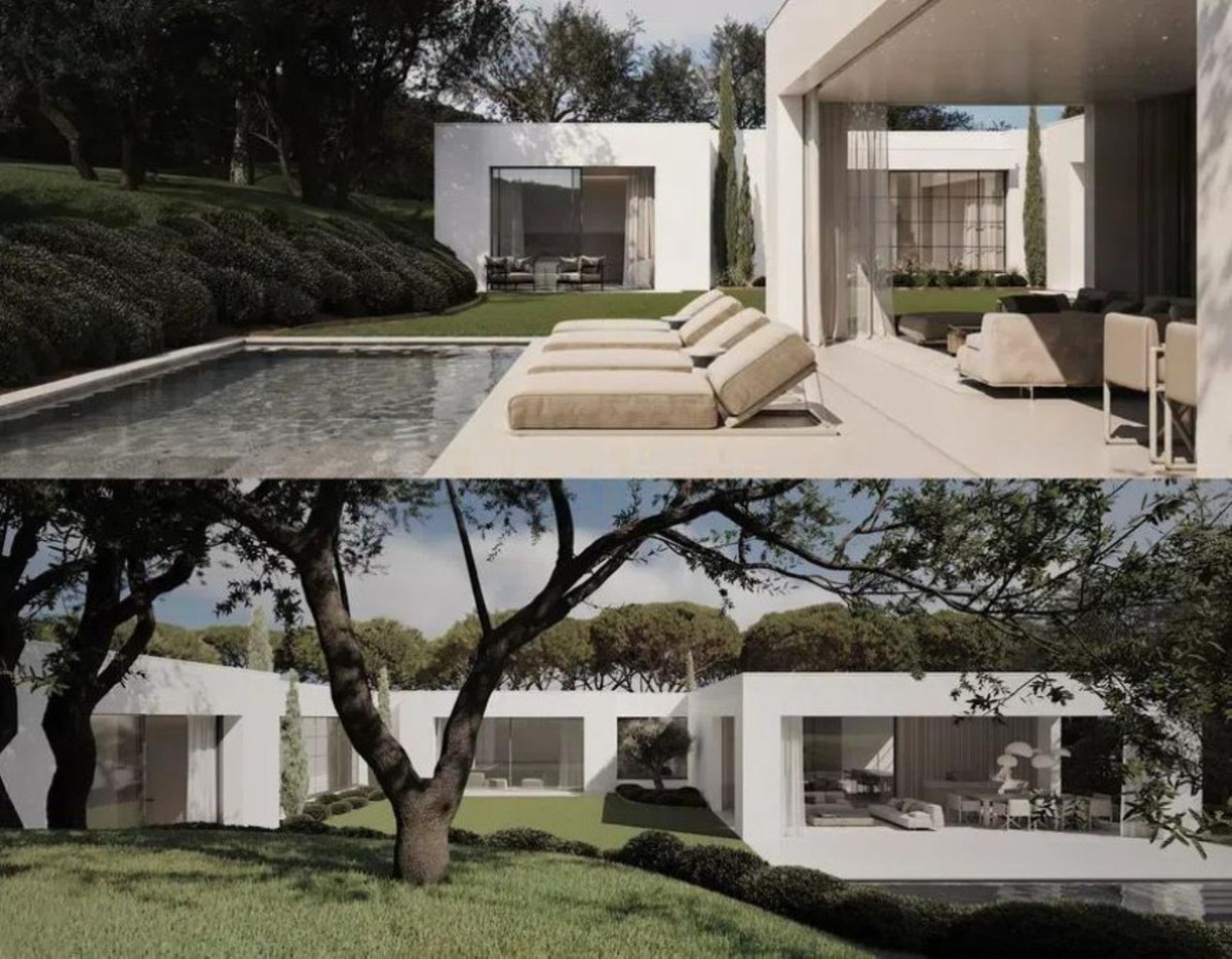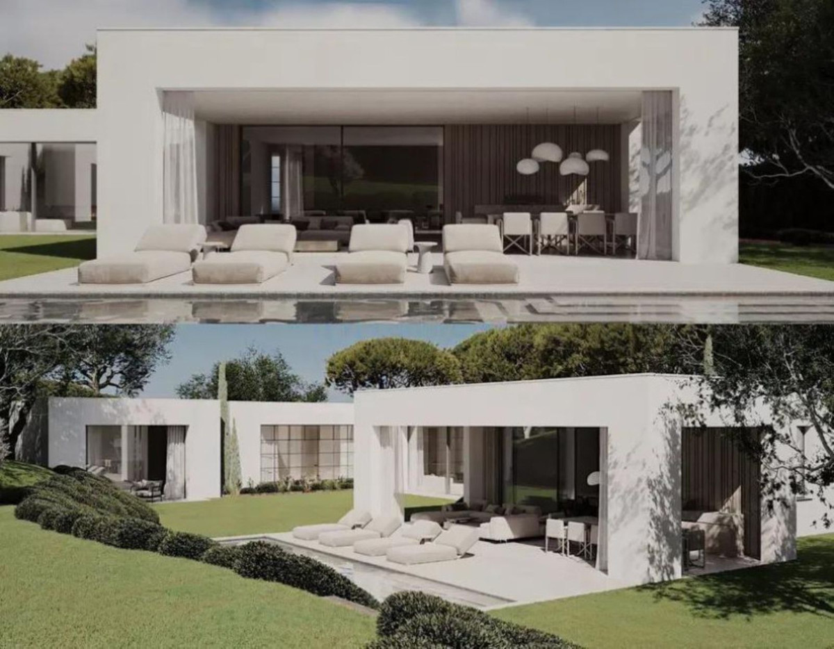 The project, designed by prestigious architects, proposes a modern single-story villa with large windows, spacious areas, a swimming pool, terrace areas, and a design perfectly integrated with the natural environment.
