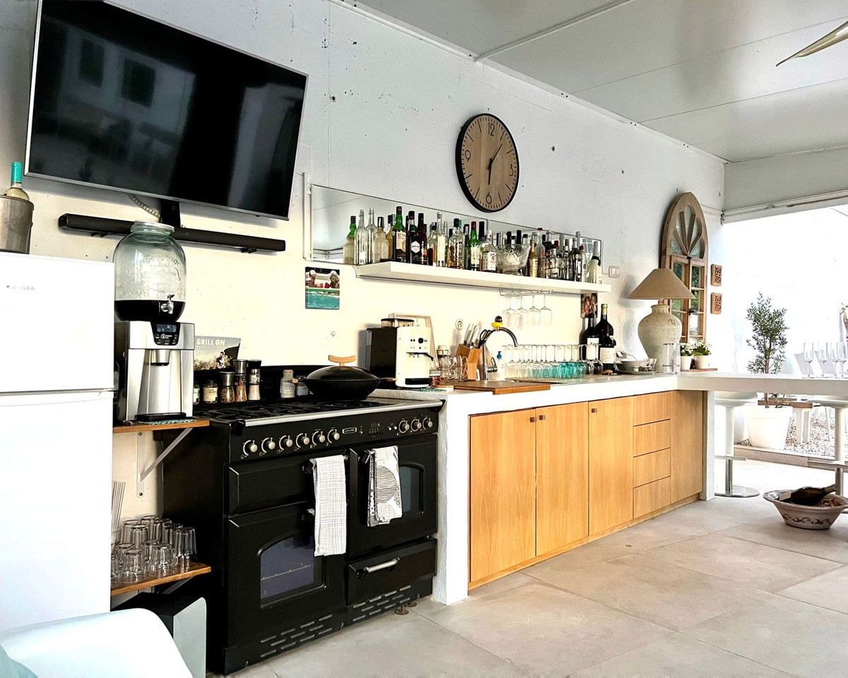 Huge covered pergola with fully equipped outdoor kitchen and glass curtains, creating a magical year-round entertainment terrace protected from wind and cooler evenings