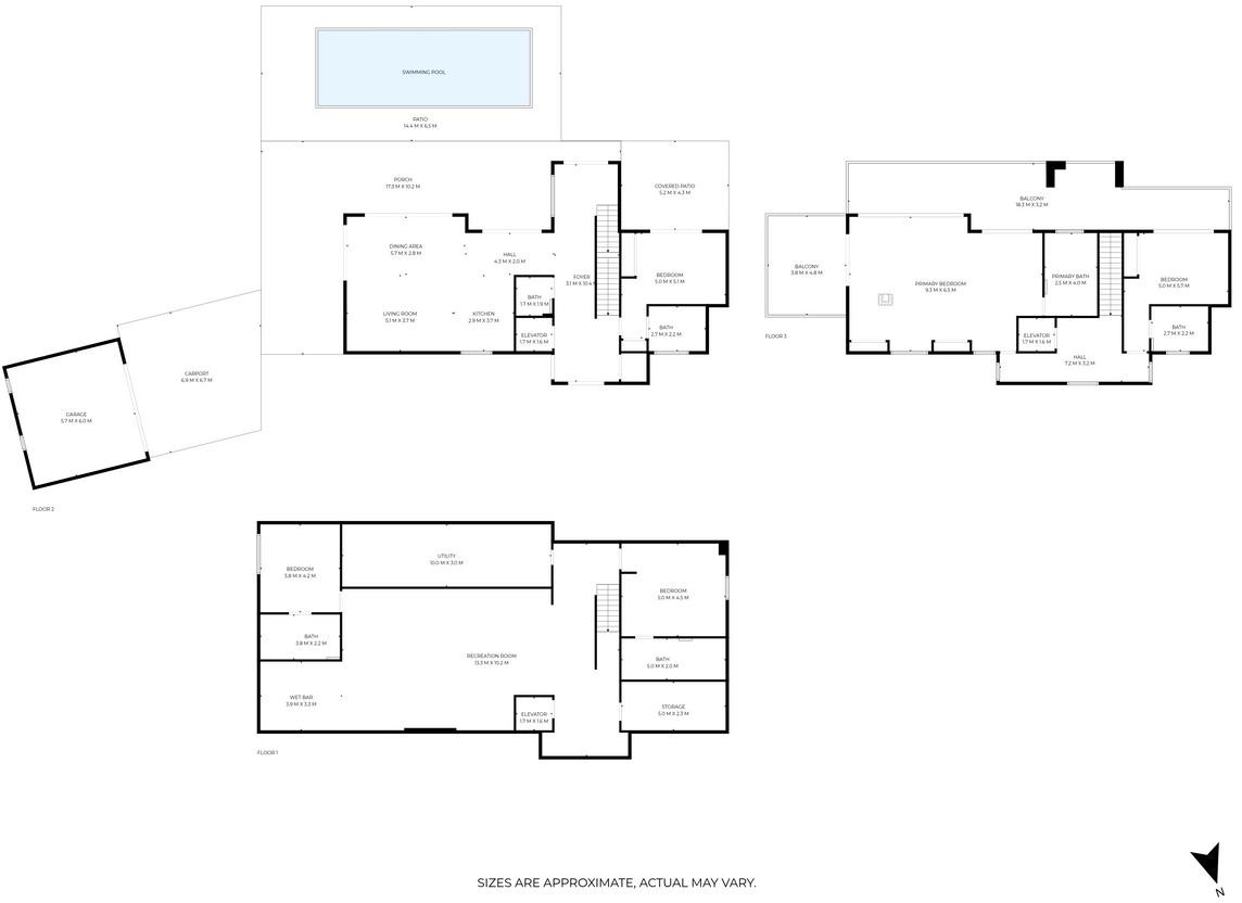The villa is equipped with its own private elevator, a closed garage for two cars, and additional parking within the carport for two more.
