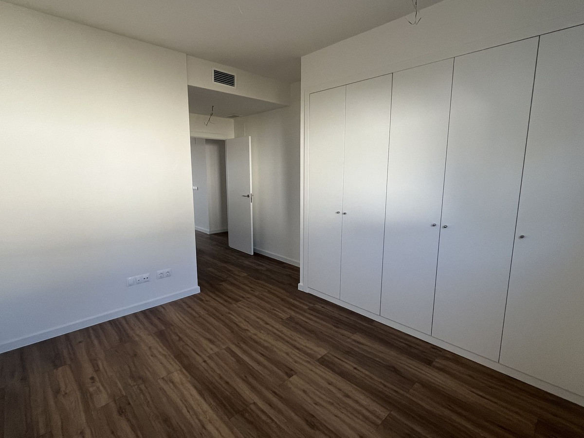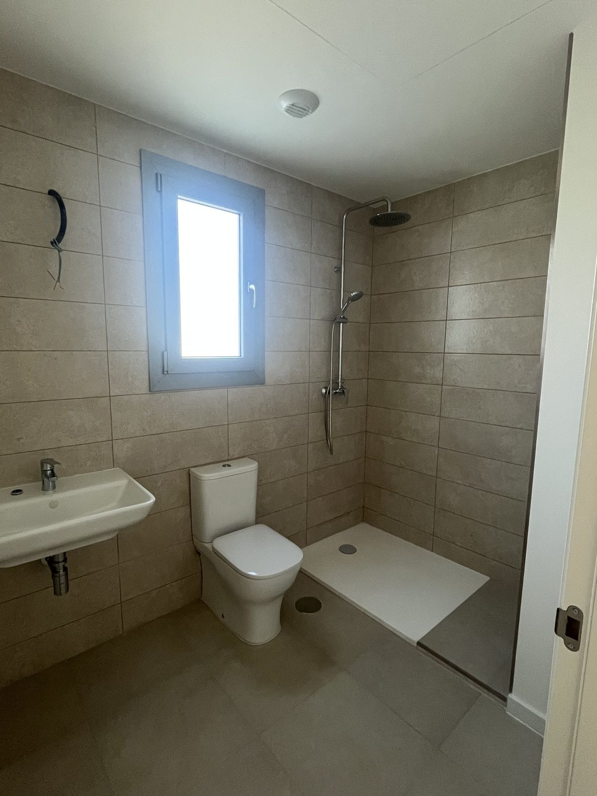 Functional layout – two bedrooms (including a master suite with its own bathroom), a second full bathroom, and a bright open-plan living area connected to the terrace through large glass doors.