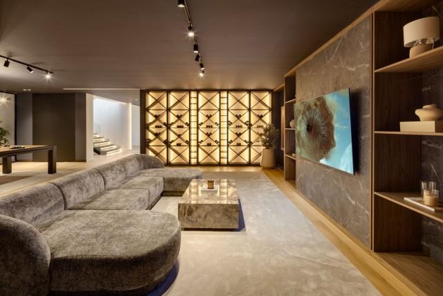 Its south-facing orientation guarantees natural light and open sea views, while its location within a gated community ensures privacy and security through advanced surveillance systems. The interior combines oak floors, large porcelain tiles, and a minimalist design that creates an elegant and welcoming atmosphere. The villa includes dedicated entertainment spaces, such as a TV room, and is delivered fully furnished in a contemporary style, with the option to purchase additional furniture at an extra cost.