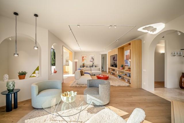 This stunning contemporary residence, located in Las Brisas, Nueva Andalucía, blends Mediterranean warmth with Scandinavian elegance, offering a concept of sustainable luxury and high-end European design. Spanning 335 m², it was created by a renowned architect who integrates clean lines with natural materials such as red and cream travertine, eco-friendly multi-layered parquet flooring, and amber wood joinery. The heart of the home is an Ernesto Meda designer kitchen equipped with Miele appliances and Fantini faucets, seamlessly connected to the living room and landscaped terraces with a swimming pool.