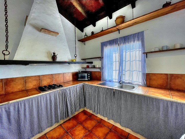 The main house, laid out on a single floor, has a bright living-dining room with a fireplace, a separate kitchen, three bedrooms and a full bathroom. Its large windows allow you to enjoy panoramic views of both the coast and the mountainous landscape.