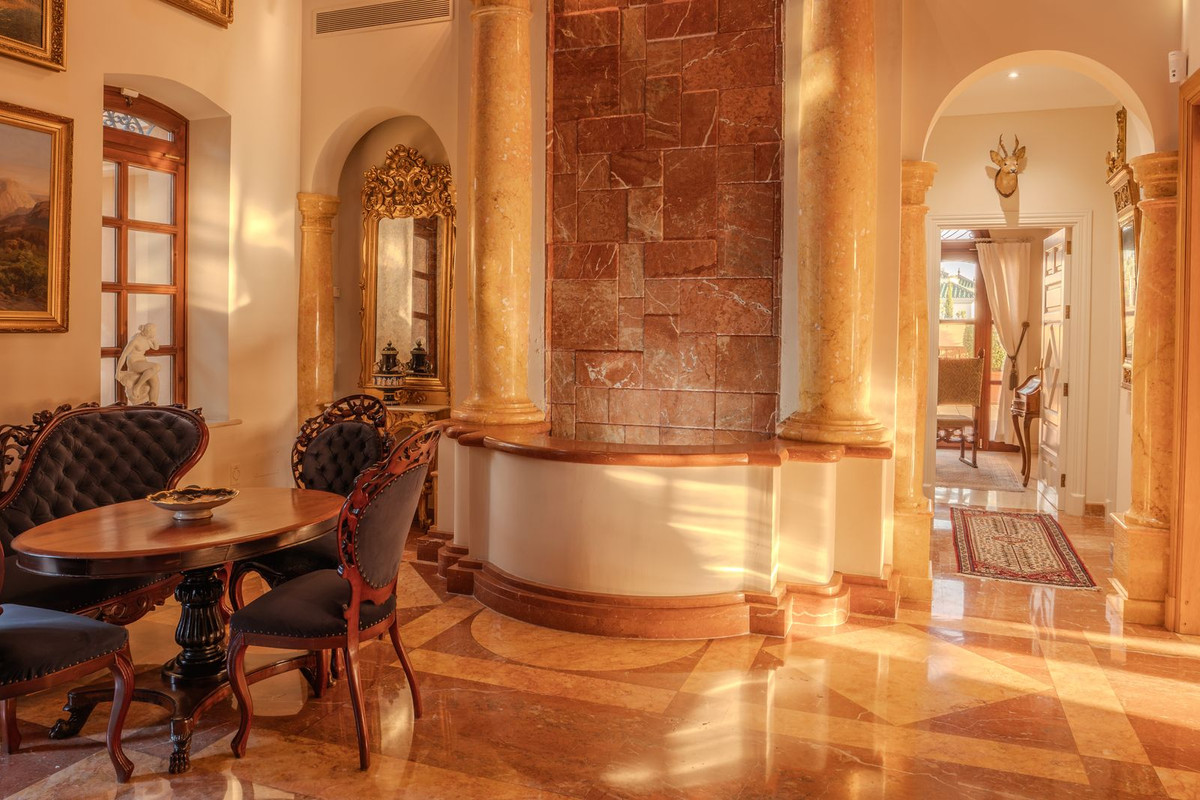 Gracefully positioned in Aloha, Nueva Andalucía- one of Marbella’s most coveted addresses, this west-facing landmark residence sits on a 3,400 m² plot and captivates with its grand, refined appearance. Its 1,727 m² of interiors showcase soaring double-height ceilings, intricate woodwork, and hand-finished marble, creating spaces of enduring beauty and sophisticated character.
