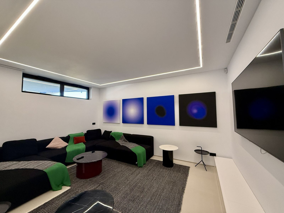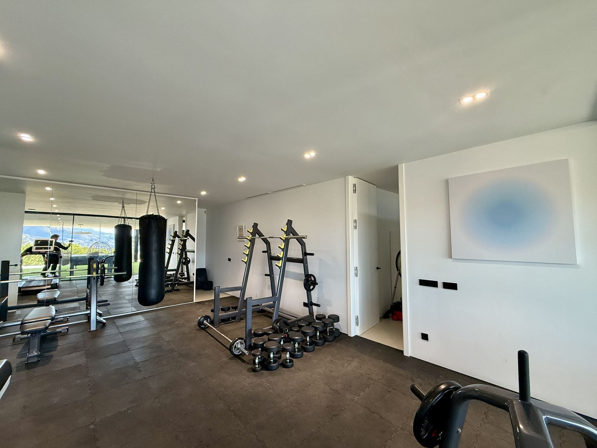 The home delivers panoramic sea and mountain views, visible from multiple vantage points. Inside you'll find a fully fitted kitchen, ample built‑in wardrobes, a covered terrace, a private terrace, a games room, a gym, storage and utility rooms, and a basement. Several bedrooms enjoy ensuite bathrooms, and the property is equipped with double glazing for comfort and efficiency. Parking is private and secure, and the villa includes practical features such as drinkable water supply and photovoltaic solar panels, combining luxury with sustainability. The furniture is optional, offering flexibility for buyers.