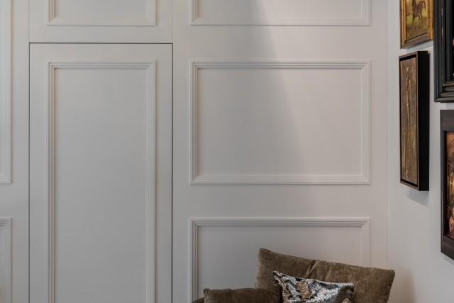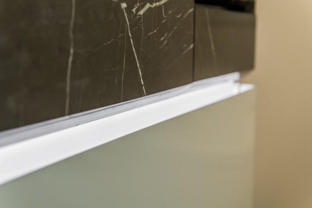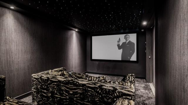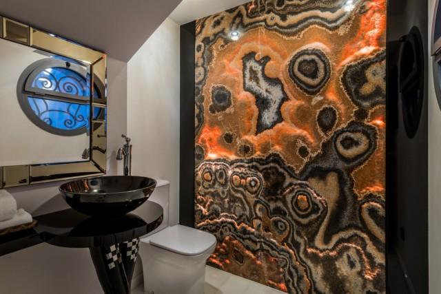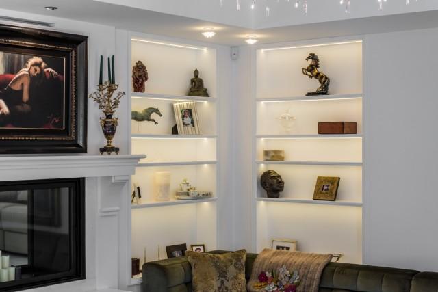 The main living room is both stylish and welcoming, centered around a sleek fireplace and complemented by bespoke shelving with ambient lighting and curated artwork. A separate formal dining room provides an elegant setting for entertaining, complete with a large wooden dining table, upholstered seating, twin chandeliers, and its own fireplace.