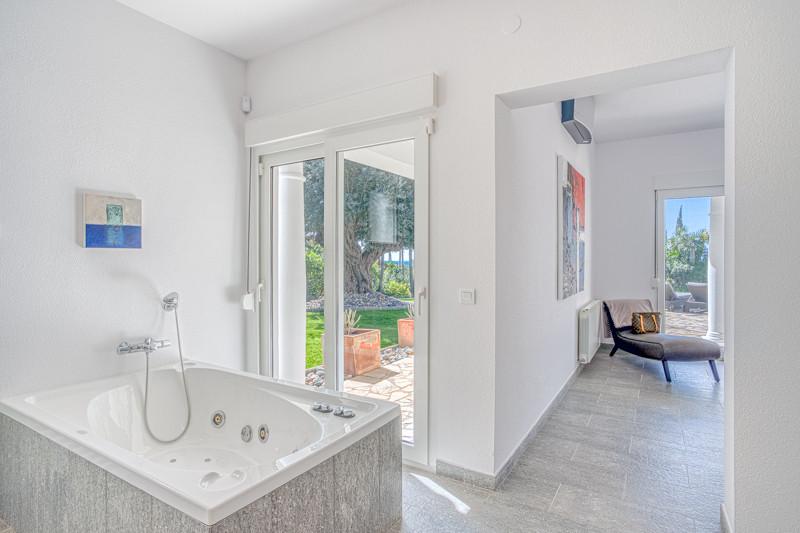 Outside, you’ll find a beautifully landscaped mature garden, centered around a majestic olive tree, and featuring an impressive heated swimming pool. The villa enjoys open views of the sea and mountains, complete privacy, and a south-facing orientation that ensures abundant natural light throughout the day. The spacious terrace is ideal for al fresco dining and outdoor entertaining.