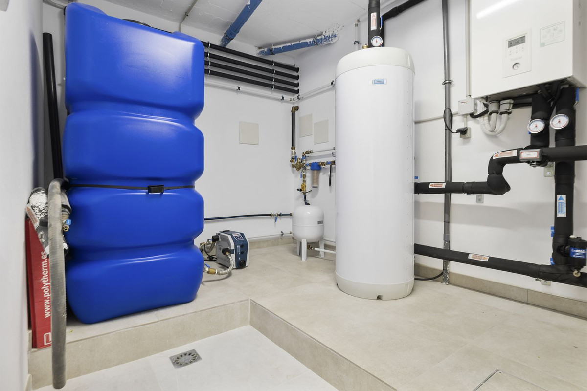 Upon entering on the ground floor, you will find a beautiful spacious living room with a glass facade so that you have a lot of natural light. A beautiful open kitchen with spacious dining table makes this an area where you literally feel at home. The kitchen is equipped with all necessary built-in Bosch appliances. Next to the kitchen there is a storage room where the washing machine and dryer are, both Bosch as well.